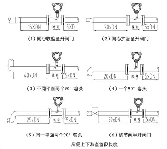 渦輪流量計(jì)對管道內(nèi)流速分布畸變及旋轉(zhuǎn)流是敏感的,進(jìn)入傳感器應(yīng)為充分發(fā)展湍流,因此要根據(jù)傳感器上游側(cè)阻流件類型配備必要的直管段或整流器,要求入口段和出口段直管段長度。