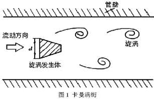 在流體中設(shè)置旋渦發(fā)生體(阻流體),從旋渦發(fā)生體兩側(cè)交替地產(chǎn)生有規(guī)則的旋渦,這種旋渦稱為卡曼渦街(見圖1),旋渦列在旋渦發(fā)生體下游非對(duì)稱地排列。根據(jù)卡曼渦街原理,有如下關(guān)系式: