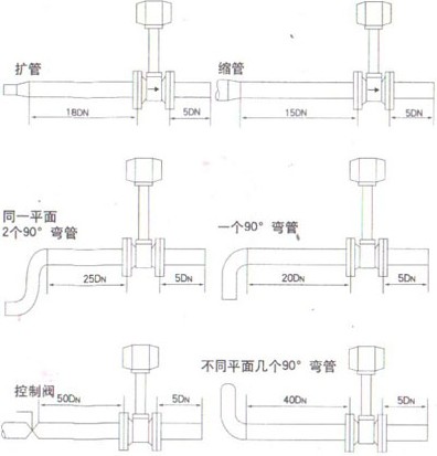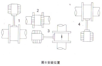安裝條件:渦街流量計應遠離振動源,有振動時在前后直管段2DN處加支架用橡皮減振。傳感器通徑圓應與直管段內徑圓保持同心。法蘭焊接時,密封夾緊時,管內不得有突出部分。流向應與箭頭方向一致。(高溫時推薦2、3、4位置,常溫和低溫時推薦1位置,垂直管道時選3位置)見圖6