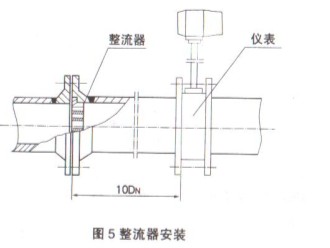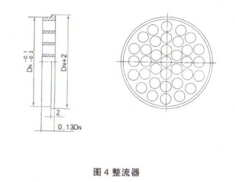 整流器的安裝:場地限制,直管段無法滿足,應安裝整流器,見圖4,是一種非均勻分布多孔整流器,結構簡單,成本低,安裝方便,阻力損失小,安裝見圖5。