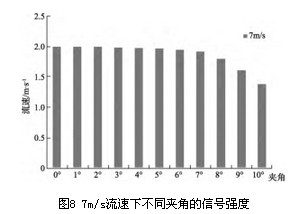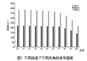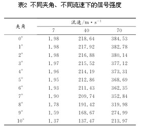 通過仿真模擬,圖4給出流速u=5m/s時,作用在三角柱上的升力系數(shù)和阻力系數(shù)變化曲線。由圖5升力系數(shù)的FFT曲線可以看出其頻率為FL=87.92Hz。從圖6阻力系數(shù)的FFT曲線可以看出其頻率為FD=176.43Hz,約為升力系數(shù)變化頻率的2倍。 為了驗證將FLUENT用于渦街流量計的三維流場仿真的可行性,對不同流速下的升、阻力頻率進行比較,如表1所示?梢钥闯鲎枇ο禂(shù)變化頻率是升力系數(shù)變化頻率的2倍,說明用FLUENT進行渦街流量計的三維仿真是可行的。 4 仿真結果 基于上述通過升、阻力變化頻率的關系驗證出利用FLUENT對三維渦街流場進行仿真是可行的。本節(jié)應用FLUENT對截流夾角、流速和信號強度之間的關系進行了仿真研究。分別取7m/s、40m/s和70m/s的流速α的角度在0°~10°范圍內(nèi)取值(發(fā)生體的安裝偏差一般不會超過10°),進行數(shù)值仿真。記錄信號強度,如表2所示。 將表2的數(shù)據(jù)繪制成圖7,將圖7中流速為7m/s的數(shù)據(jù)放大如圖8所示。觀察圖7、8,可以直觀的反應出夾角、流速與信號強度的關系變化。通過對比這3張圖可以看出,信號強度隨著夾角、流速的不同而不同。并從圖中得出結論: 1)渦街的信號強度與流速成正比,隨著流速的增加,旋渦脫落頻率信號強度會顯著增加。 2)在流速相同的情況下,隨著夾角的增大,信號強度逐漸減小,并隨著夾角的增大,信號強度的衰減程度也逐漸增大。夾角在1°~7°范圍,對信號強度的衰減影響不大,可忽略,超過7°以后對信號強度影響變大,不可忽略。 3)在夾角相同的情況下,隨著流速的增大,信號強度衰減趨勢越來越明顯。 5 結論 流場仿真在渦街流量計的設計和完善中正變得越來越重要,它通過理論支持指導仿真的可實施性,并將仿真結論用于實驗中,提高效率。通過模擬三維渦街流場三角柱繞流現(xiàn)象,將升、阻力頻率進行對比,驗證了可將FLUENT用于三維渦街流場的仿真中。并從不同流速和不同截流夾角兩方面分別考慮,對比分析了三維渦街信號的信號強度,得出夾角在1°~7°范圍,對信號強度的影響不大,超過了7°以后影響變大。從而為以后的實驗做出理論指導。進一步的研究可以通過對不同形狀的旋渦發(fā)生體取不同截流夾角和不同流速進行仿真對比研究。