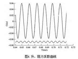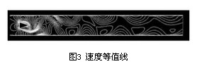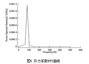 3.2 仿真參數(shù)設置 在FLUENT中,三維渦街流場參數(shù)設置如下: 1)流體:空氣(air); 2)湍流模型:Renormalization-group(RNG)k-ε模型; 3)邊界條件 ①流速入口邊界:根據(jù)需要設置不同流速、湍流動能和耗散率; ②壓力出口邊界:零壓; 4)求解器:基于壓力的三維雙精度瞬態(tài)求解器; 5)數(shù)值計算過程:SIMPLE算法。 3.3 升、阻力變化頻率的計算結果及分析 圖3所示速度等值。三維渦街流場在夾角為0°,入口流速為5m/s的情況下的速度等值線圖。