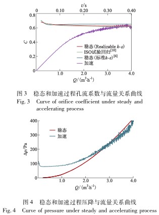 對(duì)于流量Q≤0.6m3/h,C0隨流量的增加緩慢下降,之后保持在0.63左右.與C0不同的是,C從0開(kāi)始隨流量的增大而增大,并逐漸向C0靠近,直至Q≥3.5m3/h后才達(dá)到C0的水平.C在時(shí)間上滯后于C0.圖4中△p-Q曲線(xiàn)顯示,Q≤3.0m3/h時(shí),加速過(guò)程孔板前后壓降高于同等流量下穩(wěn)態(tài)壓降;Q≥3.0m3/h后,瞬態(tài)壓降才降為穩(wěn)態(tài)水平.