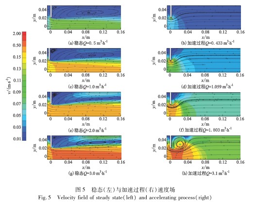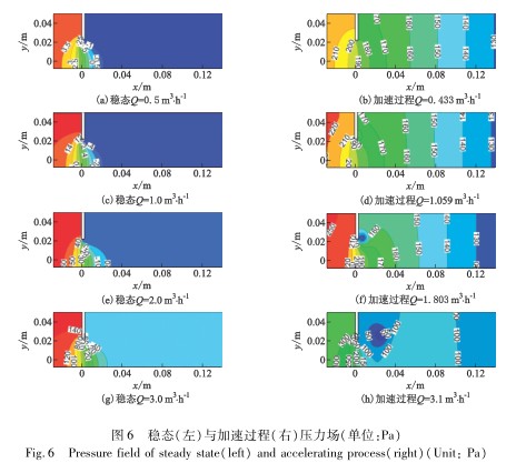 從內(nèi)流角度分析導(dǎo)致第2.1節(jié)中C和C0不同的原因,圖5和圖6分別給出并對(duì)比了相同流量下穩(wěn)態(tài)和加速過(guò)程中流經(jīng)孔板前后流體的速度和壓力場(chǎng).對(duì)于Q≤3.0m3/h穩(wěn)態(tài)條件,孔板后方始終可觀(guān)察到一個(gè)被拉長(zhǎng)的主渦和孔板右上方的小渦,流動(dòng)的損失較大,同時(shí)表明流場(chǎng)中已形成穩(wěn)定的流動(dòng)通道,動(dòng)能和壓能的轉(zhuǎn)化已達(dá)到平衡,流動(dòng)的損失(長(zhǎng)漩渦)也趨于穩(wěn)定,并且壓差隨流量的增大而穩(wěn)定增大.