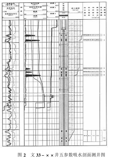 例如: 圖2是文 33-××井五參數(shù)吸水剖面測井圖,測井在2690m遇阻,第10、11、12" 號層未測出,但經(jīng)電磁流量計測井曲線顯示,這3個遇阻層吸水,絕對吸水量為74.6m3/d,相對吸水量為41.2%。