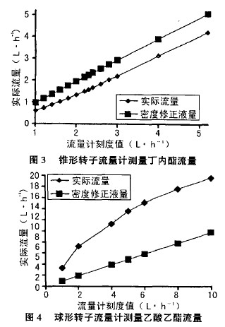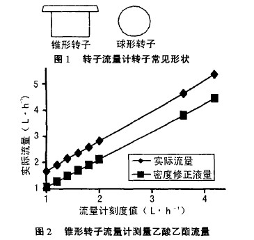 轉(zhuǎn)子流量計(jì)常見的轉(zhuǎn)子形狀如圖1所示,左邊圖形的轉(zhuǎn)子用廣泛,為錐形轉(zhuǎn)子;右邊的圖形為圓珠形,為球形轉(zhuǎn)子。用這兩種轉(zhuǎn)子流量計(jì),經(jīng)過(guò)測(cè)量,得到下列較為幾個(gè)典型的圖例。在錐型轉(zhuǎn)子流量計(jì)中,粘度為0.52mpa.s、密度為900kg·m-3’的液體乙酸乙醋的實(shí)測(cè)結(jié)果見圖2,粘度為1.gmPa·s、密度為1050kg·m-3的丁內(nèi)醋的實(shí)測(cè)結(jié)果見圖3,圖中所示的密度修正流量曲線指的是僅以密度進(jìn)行修正的曲線,其修正公式為。