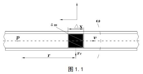 當(dāng)一個(gè)位于以P為固定點(diǎn)(旋轉(zhuǎn)中心)作旋轉(zhuǎn)運(yùn)動的管子內(nèi)的質(zhì)點(diǎn)做朝向旋轉(zhuǎn)中心或離向旋轉(zhuǎn)中心的運(yùn)動時(shí),將產(chǎn)生一慣性力,原理如圖1.1: 圖中質(zhì)量為δm的質(zhì)點(diǎn)以勻速υ在管道內(nèi)向右運(yùn)動,而管道圍繞固定點(diǎn)P以角速度ω旋轉(zhuǎn)。此時(shí)這個(gè)質(zhì)點(diǎn)將獲得兩個(gè)加速度分量:
