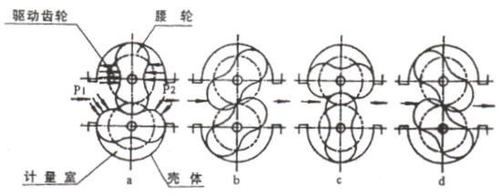 當(dāng)被測(cè)液體流經(jīng)計(jì)量室時(shí),在流量計(jì)的進(jìn)出口形成壓差,腰輪在此壓差的推動(dòng)下旋轉(zhuǎn).同時(shí)通過(guò)固定在腰輪軸上的一對(duì)驅(qū)動(dòng)齒輪,使兩個(gè)腰輪保持連續(xù)旋轉(zhuǎn)。隨著腰輪的轉(zhuǎn)動(dòng)。液體經(jīng)由計(jì)量室被不斷排出流量計(jì)。每對(duì)流過(guò)的液體量是計(jì)量室容積的四倍,通過(guò)密封聯(lián)軸器、減速機(jī)構(gòu)。將旋轉(zhuǎn)次數(shù)減速后傳遞到計(jì)數(shù)器,計(jì)數(shù)器即指示液體瞬時(shí)流量和累積流量.