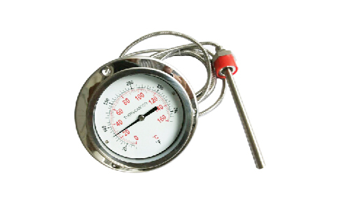 利用感溫包中液體受熱膨脹而使彈性元件產(chǎn)生偏轉(zhuǎn)來帶動(dòng)度盤轉(zhuǎn)動(dòng)指示出被測介質(zhì)的溫度。