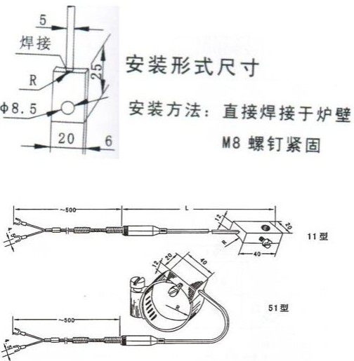 爐壁熱電偶應(yīng)用 爐壁熱電偶是采用直徑Φ4或者Φ5的鎧裝熱電偶原件作為測溫探頭,測量端用螺釘、抱箍或者焊接(采用熱電阻原件時(shí)不宜采用焊接式)等方式將測溫探頭與導(dǎo)熱板表面緊緊貼合在一起,導(dǎo)熱板的另一面有與被測面相同的曲面,導(dǎo)熱板被焊在或者卡箍緊緊與被測爐壁相貼,即可測得爐壁或者管壁的溫度。爐壁熱電偶適用于電廠鍋爐爐壁、管壁及其他圓柱體表面測溫。 爐壁熱電偶主要技術(shù)參數(shù) 型號(hào)及規(guī)格